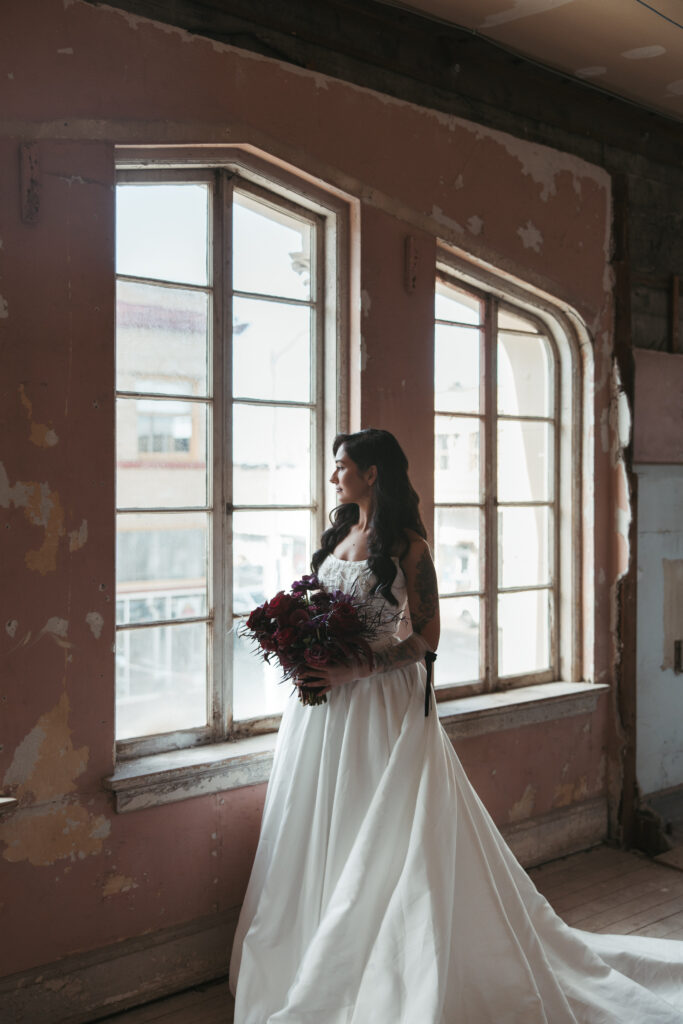 The Ruins at the Astor isn’t a manufactured aesthetic. It’s an actual former hotel ballroom that has aged into something genuinely beautiful, if somewhat a little dangerous— exposed brick, peeling plaster that looks deliberate, arched windows with soft northern light. And ancient floors upstairs that creak with every step. It holds about 30 people comfortably for an intimate ceremony, which is exactly how Emma and Jordan wanted it.